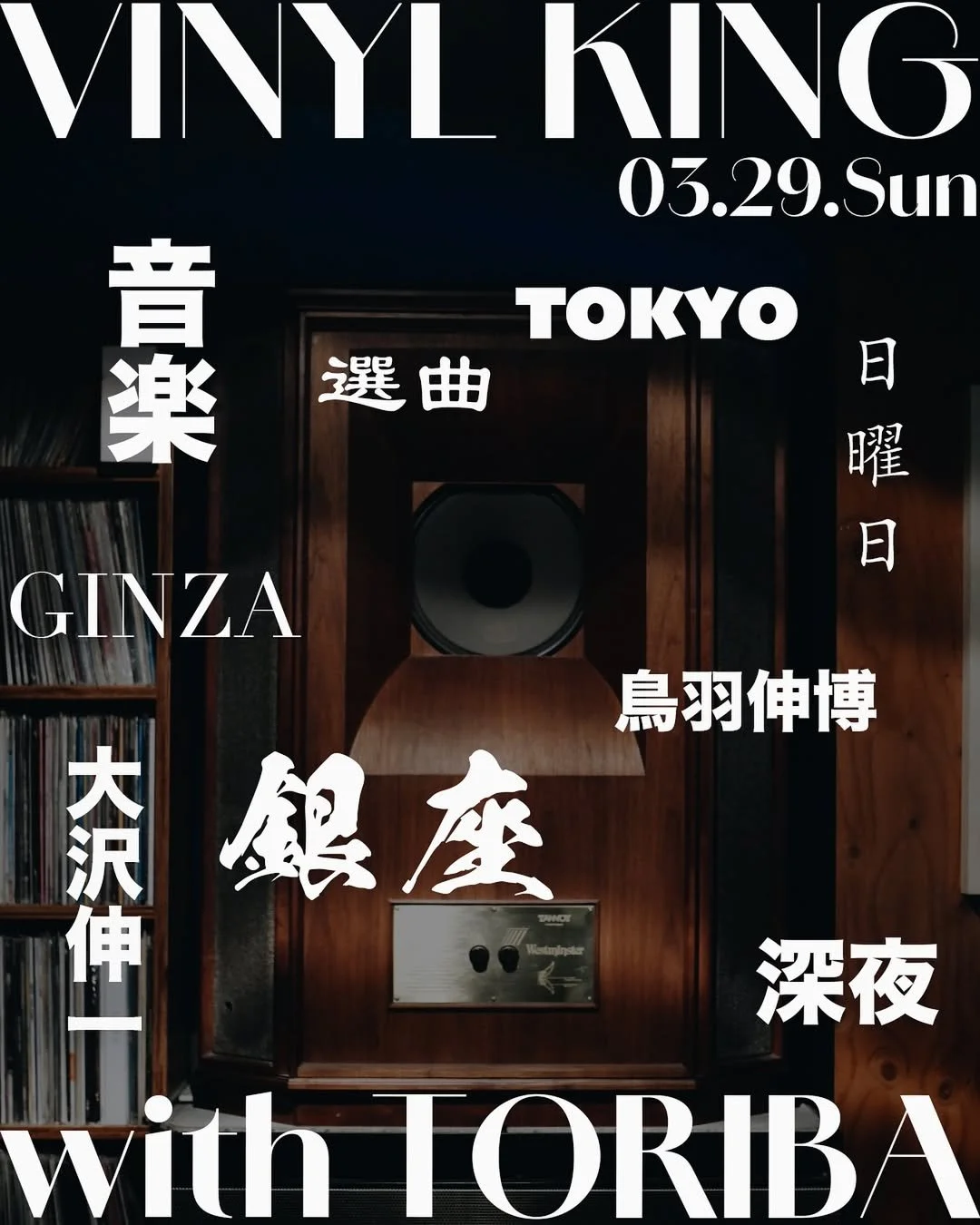 3月 27, 2026 Nobuhiro Toriba 0329 VINYL-KING 3月 27, 2026 Nobuhiro Toriba 次の日曜3/29のミュージックセレクターは ShinichiOsawa ! もう一人の店主、Nobuhiro Toribaも駆けつけます。Music Barのパイオニアが紡ぎだすミックスを、ぜひお楽しみください! Nobuhiro Toriba