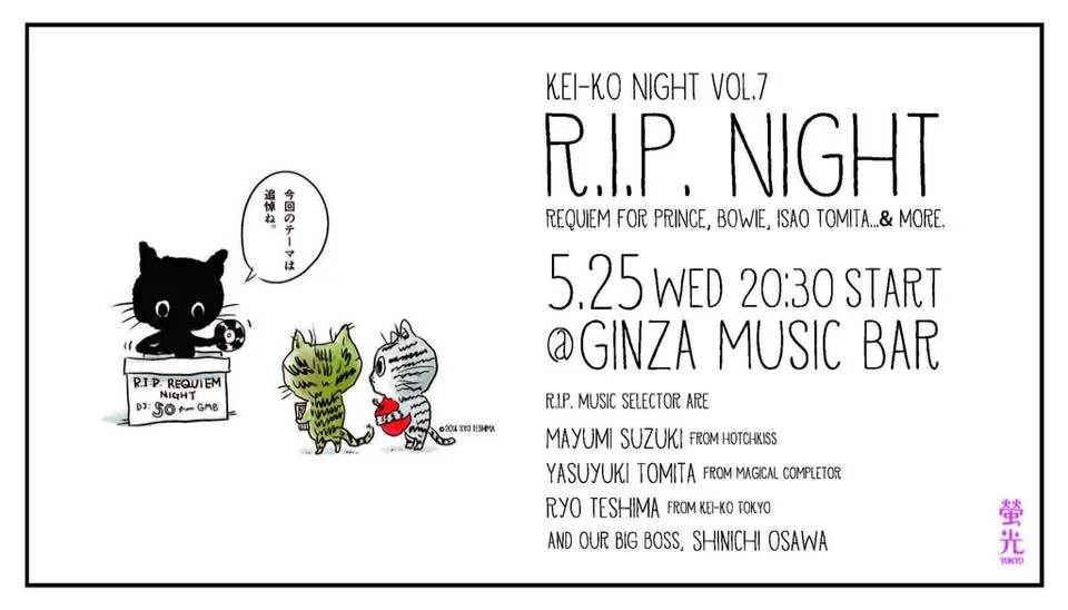 今回のテーマは『追悼』ということで今年の音楽シーンに大きな衝撃を与えたスター、DAVID BOWIEやPRINCEはもちろんのこと、我々に数々の素敵な時間を提供してくれたミュージシャンに捧げる一夜。追悼とは言えノスタルジーな雰囲気では無くお酒とともに楽しく飲み明かすお時間をお約束致します☆